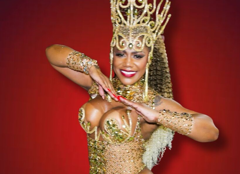 A noite de Esquenta da Série Ouro para o Carnaval 2026 foi marcada pela dedicação e o fervor das musas, e Cíntia Barbosa, musa da comunidade da Unidos de Bangu, se destacou ao celebrar uma marca pessoal importante enquanto prestava homenagem à grande estrela do enredo da escola. Cíntia apostou em um figurino ousado e vibrante, dominado pelo dourado. A cor foi escolhida estrategicamente para espelhar a luz da homenageada do próximo ano: Leci Brandão.