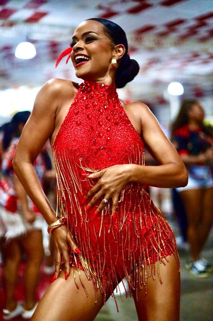 Logo ao chegar, a musa chamou a atenção pelo figurino marcante: um macaquinho vermelho com franjas, que valorizou ainda mais a silhueta da beldade e trouxe elegância, atitude e identidade à noite de ensaio. O look rendeu elogios e não passou despercebido pelos componentes e pelo público presente.
